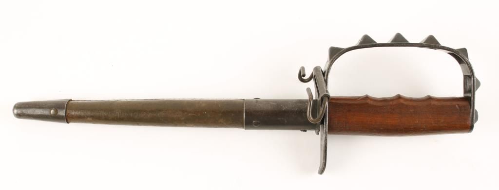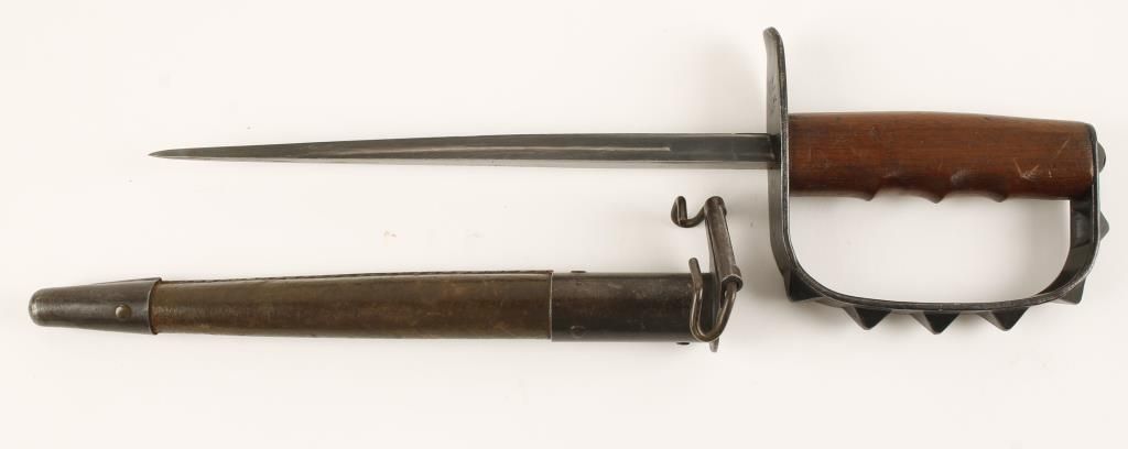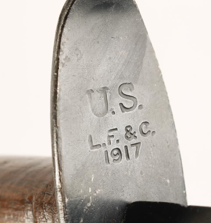 with scabbard which is very rare to find stamped "MS" and knife is marked "US L&F&C 1917" with triangular blade, in near excellent condition.