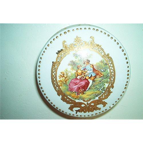 Featuring a lovely L.F. Limoges Porcelain Jewelry Box. Bottom States: L.F. Limoges-P.R.C. -Fine Porcelain (Gold stamped) Also the bottom has a round circle with the number: 31. Lovely handpainted gold trim all over. The lid displays a man & woman picking flowers. Gold band around the center with gold latch and hinges. Measurements: 21/4 inches tall; Lid diameter measures 4 1/2 inches; bottom base diameter measures 3 3/4 inches; outside circumference measures 15 inches; Depth measures 1 3/4 inches; the lid depth measures 1/2 inch. Excellent to mint condition. No chips, cracks, etc.
