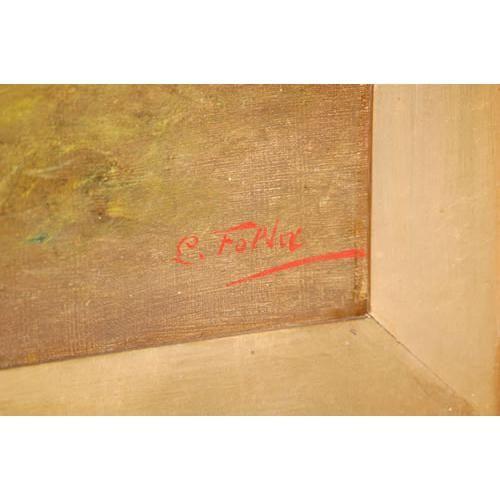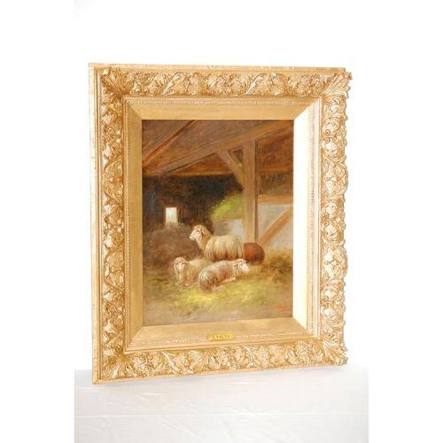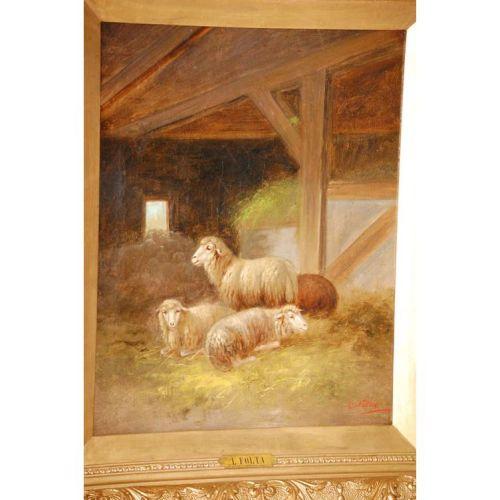L. FOLTA ITALIAN SCHOOL OIL ON CANVAS OF SHEEP FOLD- SIGNED L. FOLTA ON LOWER RIGHT, ALSO W/ L. FOLTA METAL PLAQUE ON FRAME IN A GILT PLASTER MOLDED FRAME (20" X 15 3/4") - CRAQUELURE, OLD REPAIR & IMPERFECTIONS