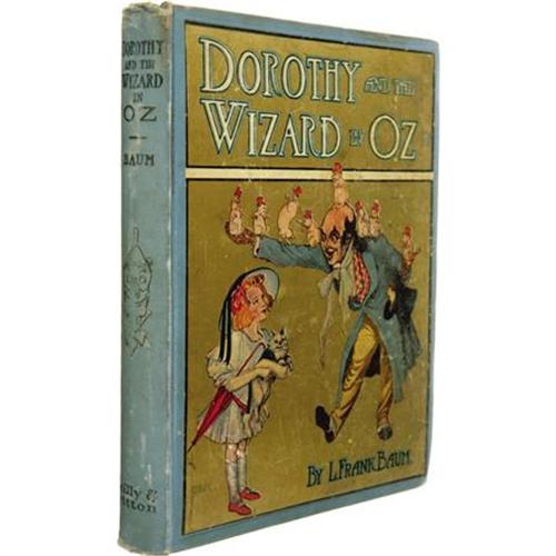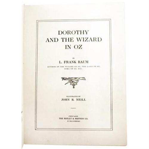<B>L. Frank Baum: </B></I><B><I>Dorothy and the Wizard of Oz</B></I></B></I>. (Chicago: Reilly & Britton Company, 1906), first edition, second state without "Co" at bottom of spine, 256 pages, 16 color plates and numerous other illustrations by John R. Neill, vertically ribbed, light-blue cloth with pictorial label in colors against a metallic gold background, pictorial endpapers, 8vo (7” x 9.25”), former owner’s name written in pencil across from half title page, child’s pencil scribble on page 49, large tear on leaf with page 13 and 14, fold crease on rear endpaper, shelf wear to the boards at the edges and corners, spine rubbed, pastedown illustration on front board lightly rubbed but still bright, small stain on rear board, else a sound copy, in near very good condition.<BR><BR><b>Shipping:</b> Books & Catalogs (<a target="_blank" href="http://www.heritageauctions.com/common/shipping.php">view shipping information</a>)