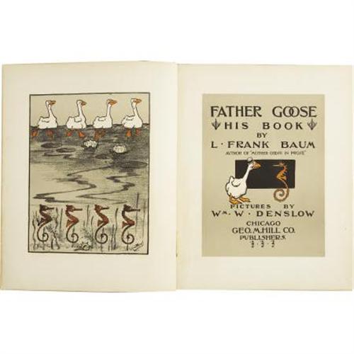 <B>L. Frank Baum. </B></I><B><I>Father Goose - His Book</B></I></B></I><B>.</B></I> Chicago: Geo. M. Hill Co. Publishers, [1899]. <BR>First edition. Quarto. More than one hundred un-numbered pages, each with verse and accompanying full-page illustration by W.W. Denslow.<BR><BR>Gray pictorial paper boards with black cloth spine. Inscription <I>"</B></I>from Uncle Henry<I>" </B></I>on flyleaf. Wear to board edges and corners. Interior pages show a few faint smudges and page creases, overall very good condition. Baum and Denslow were friends who decided to collaborate on a book, and agreed to self publish this much-loved children's book of verse. However, as funds were tight, the book was hand-lettered rather than typeset to save money. Filled with inside jokes shared by the author and artist, offering a running commentary on their lives, friends, and family. The finished work was a great success, becoming the best-selling children's book of the year. An important and desirable early Baum effort.<BR><BR><b>Shipping:</b> Books & Catalogs (<a target="_blank" href="http://www.heritageauctions.com/common/shipping.php">view shipping information</a>)