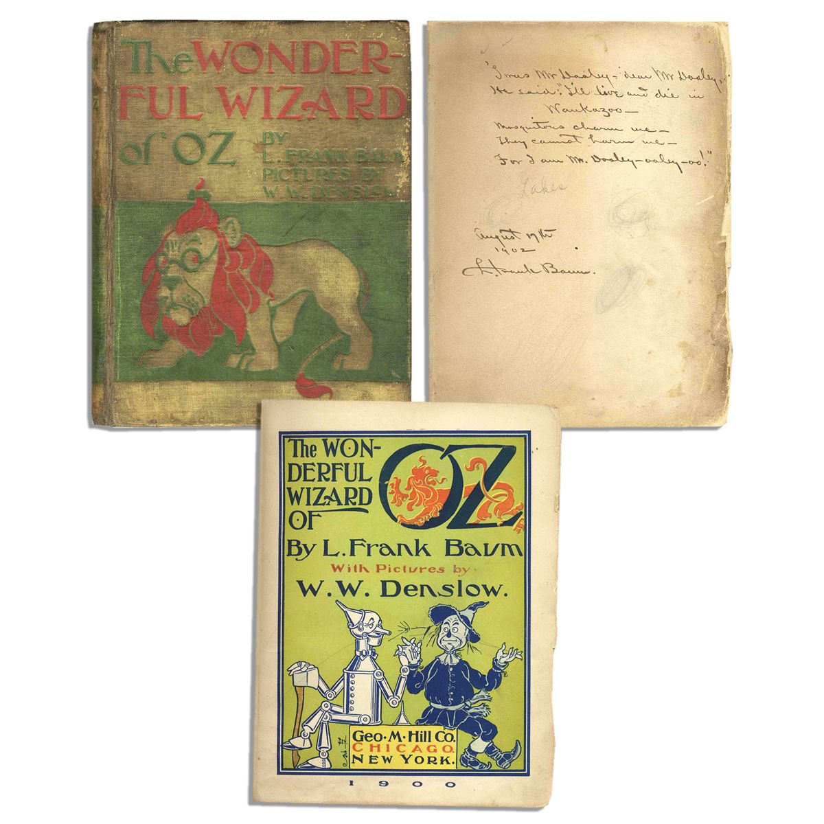 ''The Wonderful Wizard of Oz'' by L. Frank Baum, illustrated by W.W. Denslow. Chicago: George Hill Company: 1900. First edition, second state, signed by the author. Baum inscribes on the author list leaf: '''Twas Mr Dooley dear Mr Dooley, / He said: 'I'll live and die in Waukazoo / Mosquitoes charm me / They cannot harm me / For I am Mr. Dooley-ooley-oo! / August 17th / 1902 / L. Frank Baum.'' The book is in the second state, and in binding variant C. Included in the lot is a letter of provenance from the granddaughter of the original recipient Dorothy Lake. It explains that her grandmother was 11 years old in 1902 and went on a holiday every summer to Waukazoo on the shores of Lake Michigan. Baum was reportedly charmed by Miss Lake and by the coincidence of meeting a real Dorothy in the same resort area in which he wrote portions of ''The Wonderful Wizard of Oz.'' Original pictorial cloth stamped in red and green. Leaf with inscription is browned and a little chipped at edges and with a 2-inch closed tear through ''A'' of ''August.'' Plates and text leaves frayed with some extremity loss. With 22 color plates, missing the two facing pages 80 and 254. Volume has been rebacked with original spine laid down, to an attractive condition though boards still remain heavily soiled. Presentation copies of Baum's masterpiece are very scarce on the market, and verse inscriptions particularly so; this is perhaps the only verse inscription available.