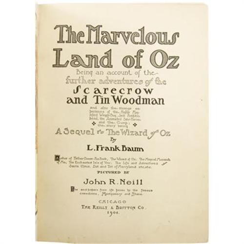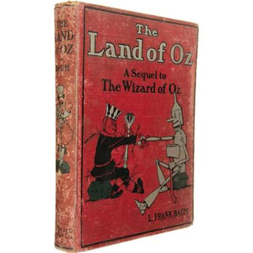 <B>L. Frank Baum: </B></I><B><I>The Land of Oz</B></I></B></I>, <I>A Sequel to The Wizard of Oz</B></I>. (Chicago: Reilly & Britton Company, 1904), second edition with “Published, July, 1904” on the copyright page, with shortened title on cover (complete title <I>The Marvelous Land of Oz</B></I>), full title on title page, 287 pages, 16 color plates and numerous other illustrations by John R. Neill, brick red pictorial boards with silver titles, pictorial endpapers, 8vo (7” x 9.5”), child’s penciled scribbling on the ffep, pages toned as usual, front hinge shaken, insect damage to boards with scuffing at the corners, board edges and spine, else a sound copy internally in good condition.<BR><BR><b>Shipping:</b> Books & Catalogs (<a target="_blank" href="http://www.heritageauctions.com/common/shipping.php">view shipping information</a>)