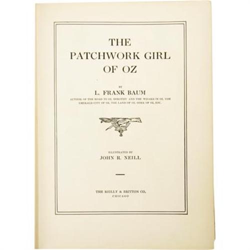 <B>L Frank Baum: </B></I><B><I>The Patchwork Girl of Oz</B></I></B></I>. (Chicago: Reilly & Britton Company, 1913), first edition, second state (“Chap. Three”, page 35 does not overlap text), 340 pages, 50 color and numerous other illustrations by John R. Neill, light green pictorial cloth with red, yellow and dark green titles and illustrations, pictorial endpapers, 8vo (7” x 9.5”), fold creases on pages 217 through 222, a small stain to fore edge, a few small stains on pages, no names in the “This Book Belongs To” page, shelf wear to boards including rubbed and bumped corners, with some insect damage on the spine and edges of the boards, boards lightly soiled, else a remarkably tight copy in near very good condition and mercifully free of children’s penciled scribbling.<BR><BR><b>Shipping:</b> Books & Catalogs (<a target="_blank" href="http://www.heritageauctions.com/common/shipping.php">view shipping information</a>)