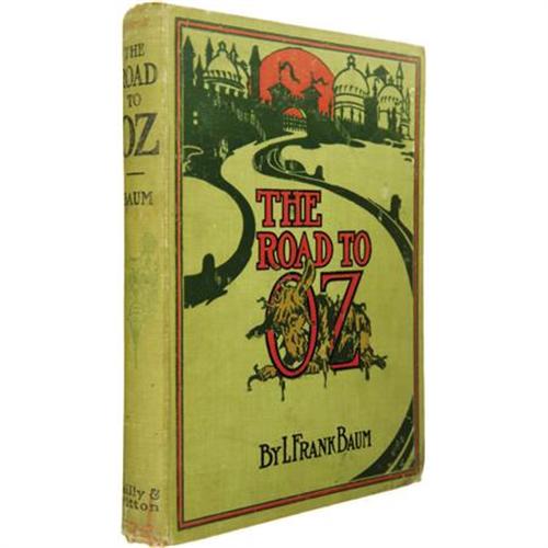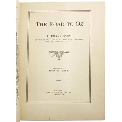<B>L. Frank Baum: </B></I><B><I>The Road to Oz</B></I></B></I>. (Chicago: The Reilly & Britton Company, 1909), first edition, first state with all points including appropriate colors of paper in various gatherings, perfect text on "Toto on" on page 34 and number on plate on page 121, ads for 7 Laura Bancroft books and 4 Baum books at rear, first binding, with lower case in all but initials on Reilly & Britton on spine, 261 pages, illustrations by John R. Neill, pictorial boards, pictorial endpapers, 8vo (7” x 9.5”), "This Book Belongs To" page with penciled child’s name, penciled child’s name and inked ownership stamp facing half title page, penciled child’s marginalia on rear endpaper, pages toned as usual, front and rear internal hinges cracked but text block tight, pages 259 through 261 with fold creases, soiling and moderate shelf wear to boards, corners bumped, spine ends frayed, dent in edge of rear board, else a good copy of the scarce first issue of Baum’s classic.<BR><BR><b>Shipping:</b> Books & Catalogs (<a target="_blank" href="http://www.heritageauctions.com/common/shipping.php">view shipping information</a>)