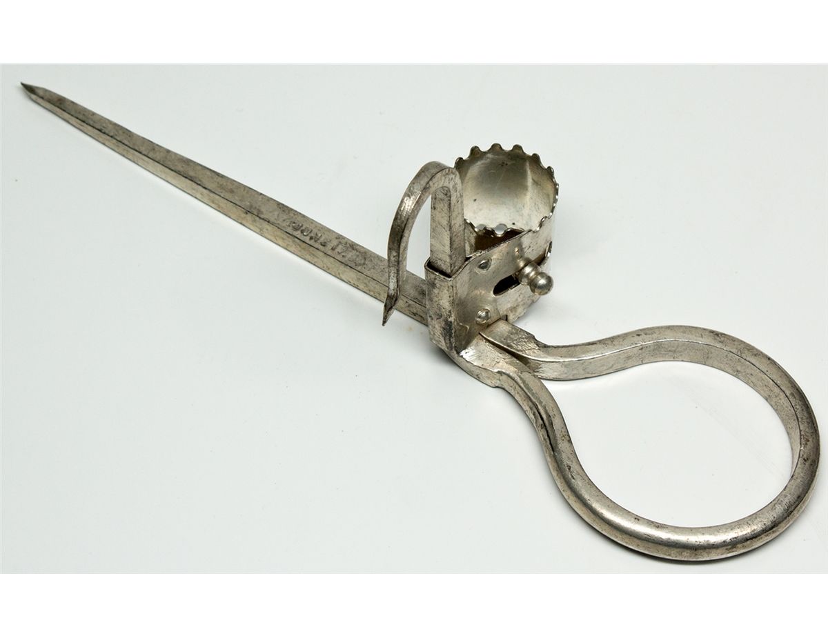 This stick measures 7.5” long and has a patent date of June 17, 1890. This stick was made by Louis H. Sholder, and was patent #430,488. This stick features a distinctive castellated thimble, which appeared to be a common theme with Sholder made sticks. There is some minor wear on this stick, and it appears to have been polished. [REF: A Collector’s Guide to Antique Miners’ Candlesticks by Wilson & Bobrink]. - HKA#63497