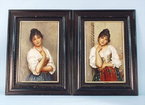 L. HAUSER - 19th century Austrian school of Eugen de Blaas. "The Young Ladies." A pair of romantic oil paintings on board. Each signed lower left. 27 1/2" x 15 3/4". Black lacquer finished frames.