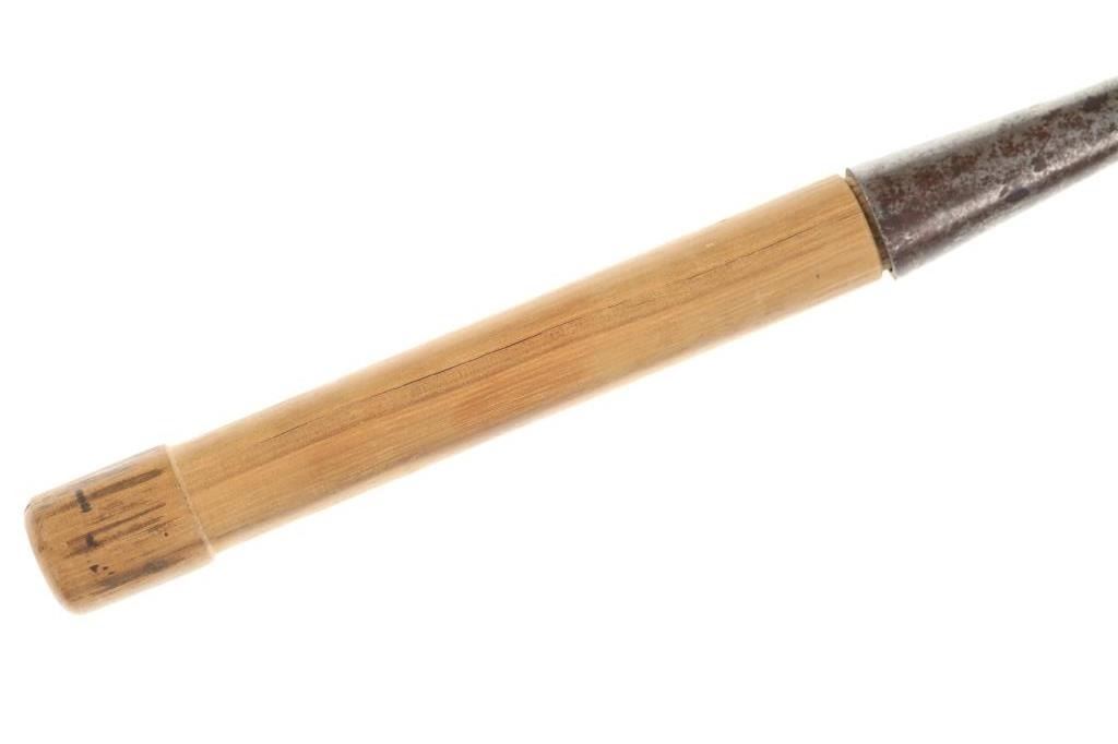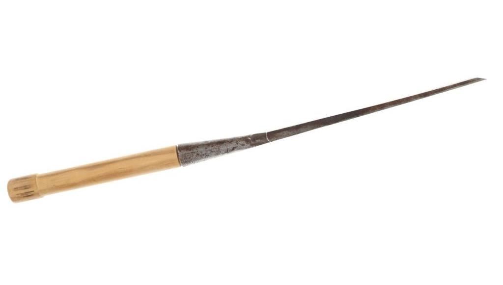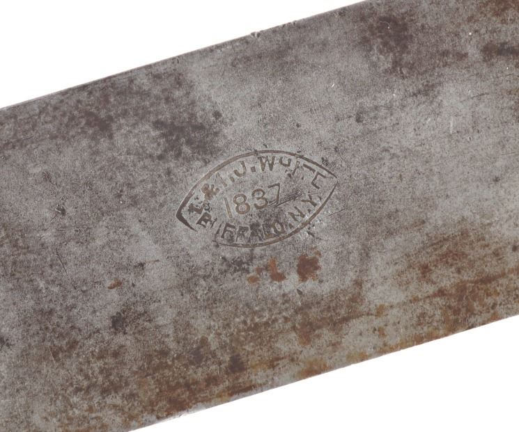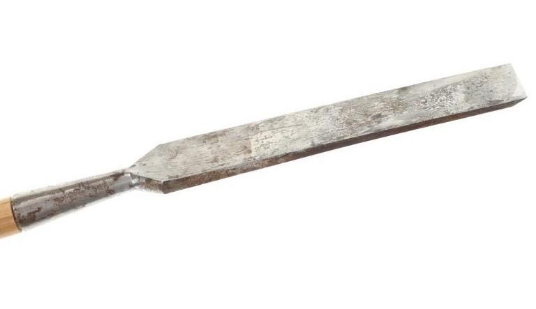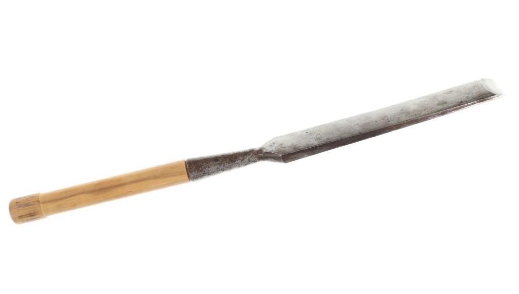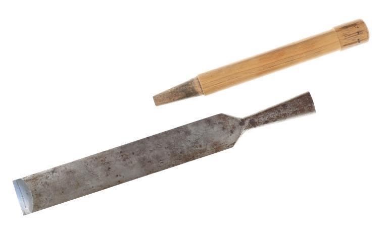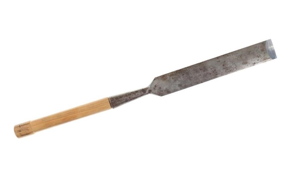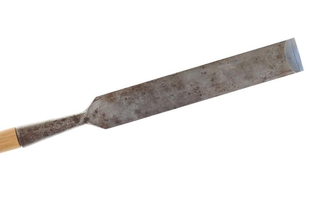 Featured in this lot is this L & I J wooden handle beveled chisel circa 1837. The chisel features a wonderfully and professoinally crafted stainless steel and wooden construction that shows a beveled blade with a flared handle and a wooden handle. The chisel is marked as followed: L & I J White - 1837 - Buffalo, N. Y. The condition of this beveled chisel is good with a slight oxidation and patina but otherwise shows good overall condition. The measurements of this chisel is 26" x 2" x 1 1/4". The collective weight of this chisel is 4lb.