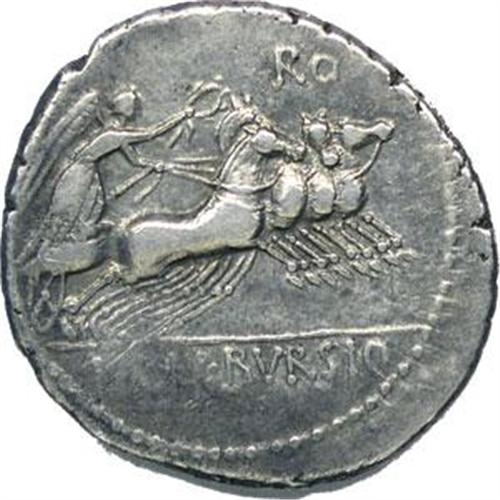 L. Iulius Bursio. Denario, 85 a.C. D/ Testa di Apollo Vejovis a destra. R/ La Vittoria in quadriga a destra. Cr. 352/1c. B.5. gr. 3.65 AG. Delicata patina. BB+.