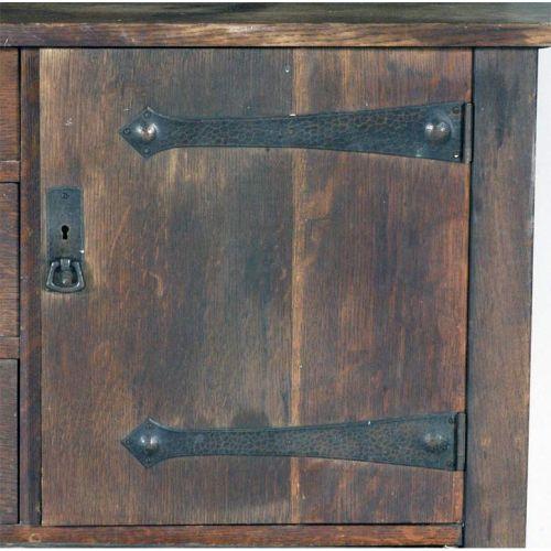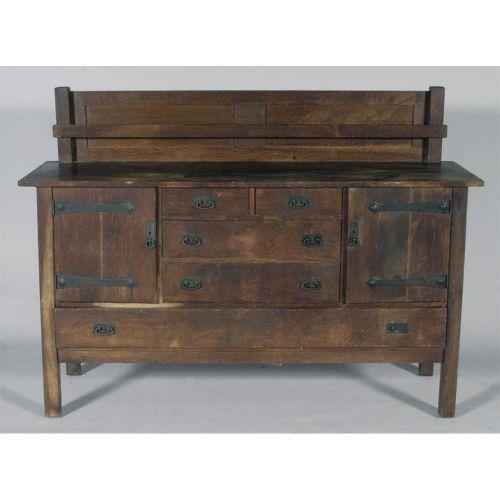 L&J STICKLEY MODEL 736 OAK SIDEBOARD with hammered strap hinges unsigned, 48" high, 66" long, unsigned. CONDITION REPORT: original finish with various ink stains (to top), water stains, fading. The long drawer and cabinet doors do not close easily (tight), otherwise it is in very nice condition and structurally solid.