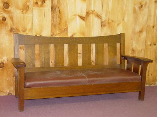 L & JG STICKLEY BENT ARM SETTEE (#263) W/ 7 SLAT BACK 2 SLATS UNDER ARM (77" L X 28" D X 37" H) - OLD FINISH W/ PARTIAL CLAMP LABEL, WEAR & IMPERFECTIONS