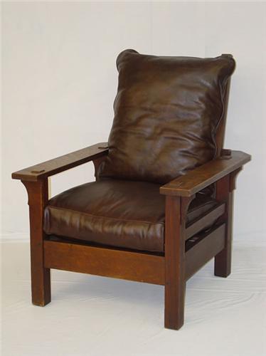 L & JG STICKLEY OPEN ARM MORRIS CHAIR (#470) (32" W X 46" H X 36" D) - OLD FINISH, WEAR & IMPERFECTIONS