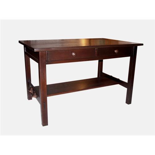 Description: L&JG Stickley desk / library table with keyed lower shelf and pegs.
