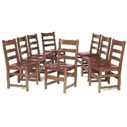 L & JG Stickley dining chairs, #1350, set of eight, ladderback form with three horizontal slats over a hard leather seat, fine original finish, signed with Handcraft decal, excellent original leather on six, two are professionally replaced, 18”w x 18”d x 37”h, excellent condition