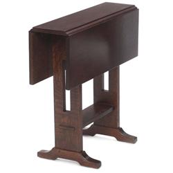 Contemporary L & JG Stickley drop leaf tea table #509, Prairie School influence with rectangular cut-outs at sides over a shoe foot base with lower stretcher having thru-tenon construction, branded “Stickley,” 24”w x 8”d x 24”h, very good condition