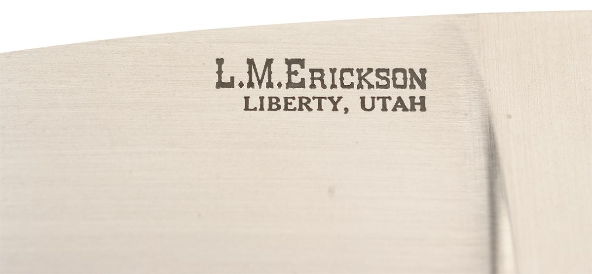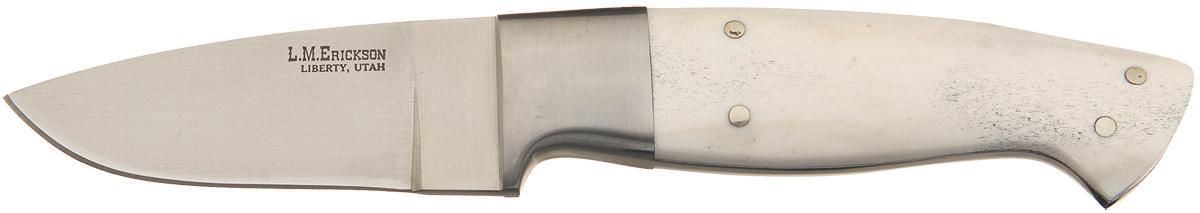 This knife was handcrafted by Master Knifemaker and Knifemakers' Guild member L. M. Erickson who has been making knives professionally for over 25 years. The blade of this knife is marked "L.M. ERICKSON / LIBERTY, UTAH". Plain stainless steel bolster, with bone scales secured to the tang with four rivets. OAL: 7 5/8".