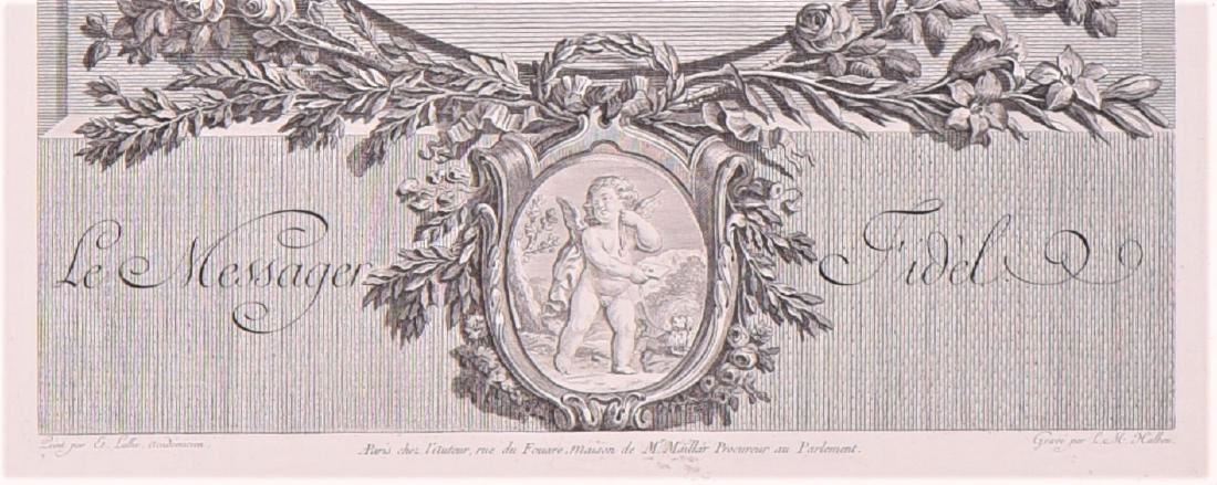 L. M. Halbou Romanticism Style hand colored copper plate engraving late 1700's " Le Messager Fidel" Full margins, B K Rives paper Size 25.5 x 20 inches. Estimated more than 300 yrs old. Fine Art. (Photos Represent The Lot Condition. Read T&C's)