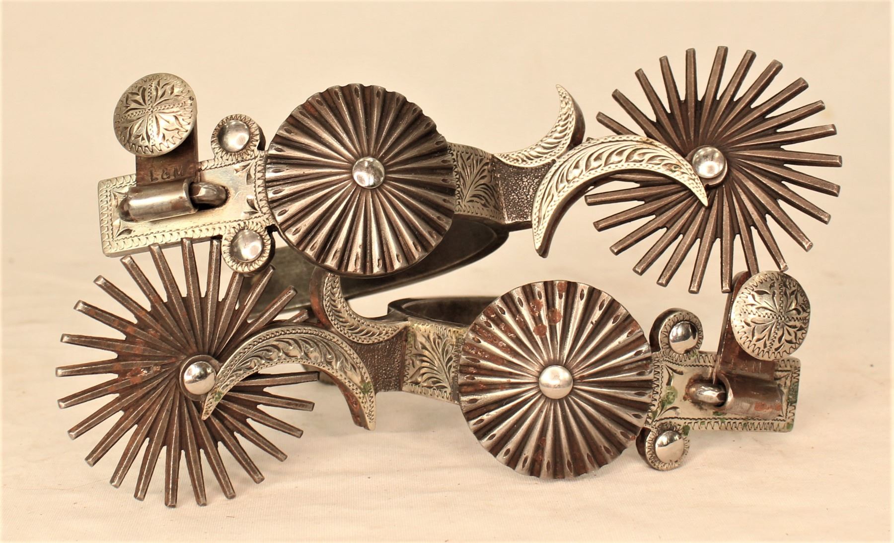 Stunning pair of double mounted spurs done in a variation of the Hollywood Special, with large jello mold conchos, cresent moon shanks, and huge multi-point rowels.