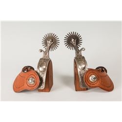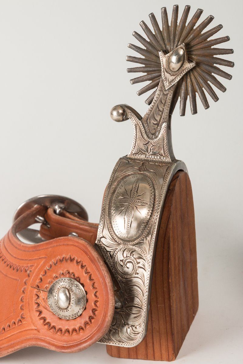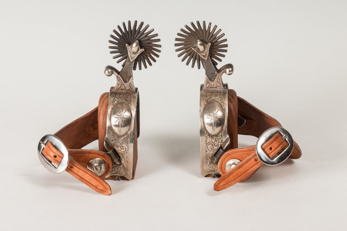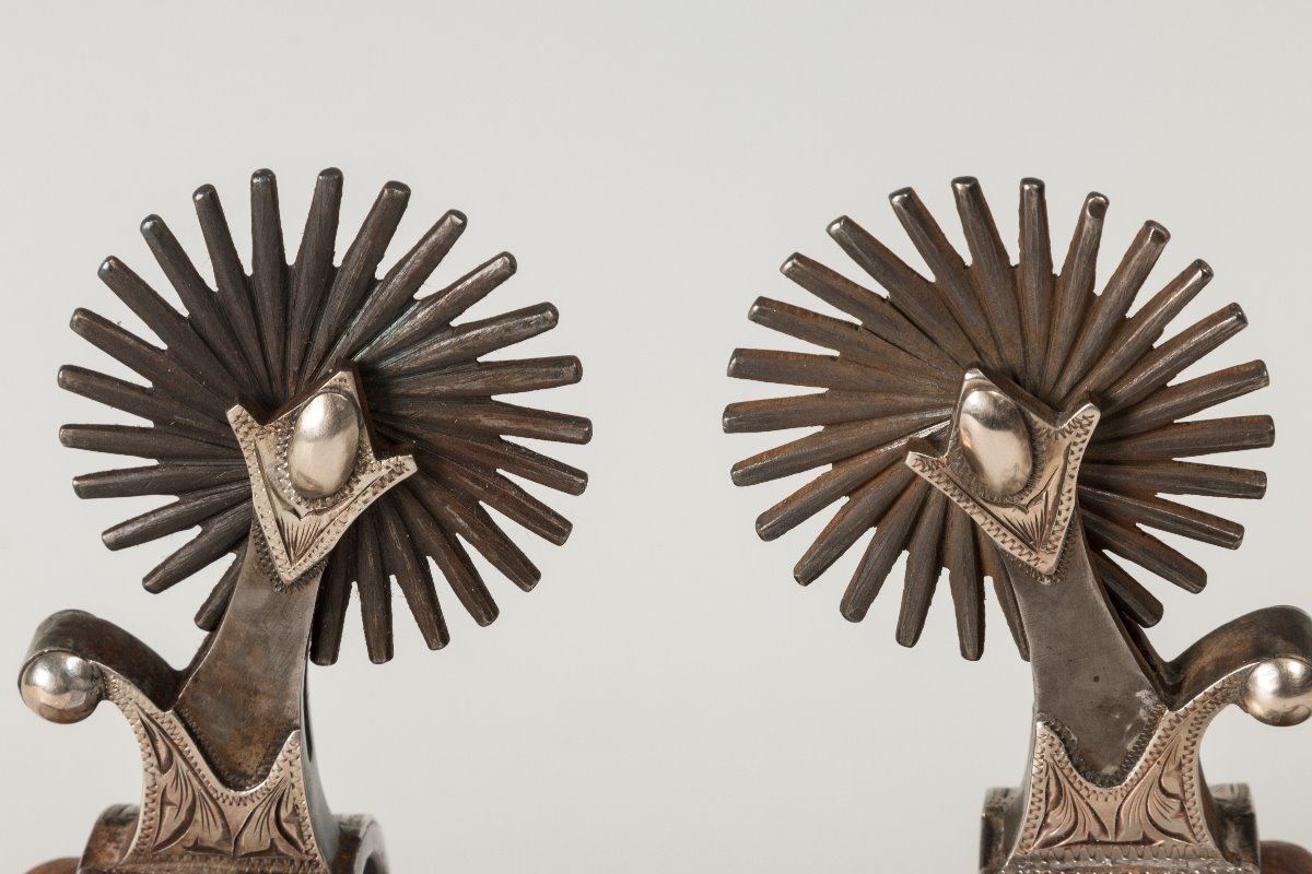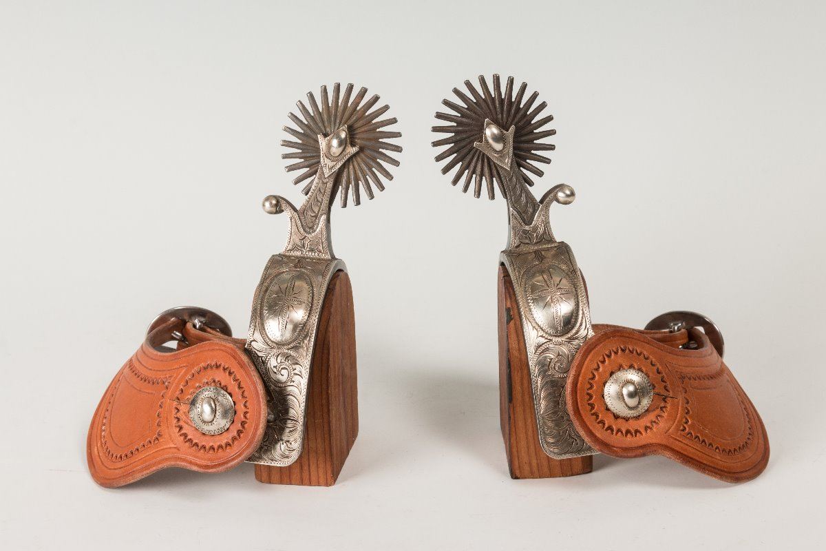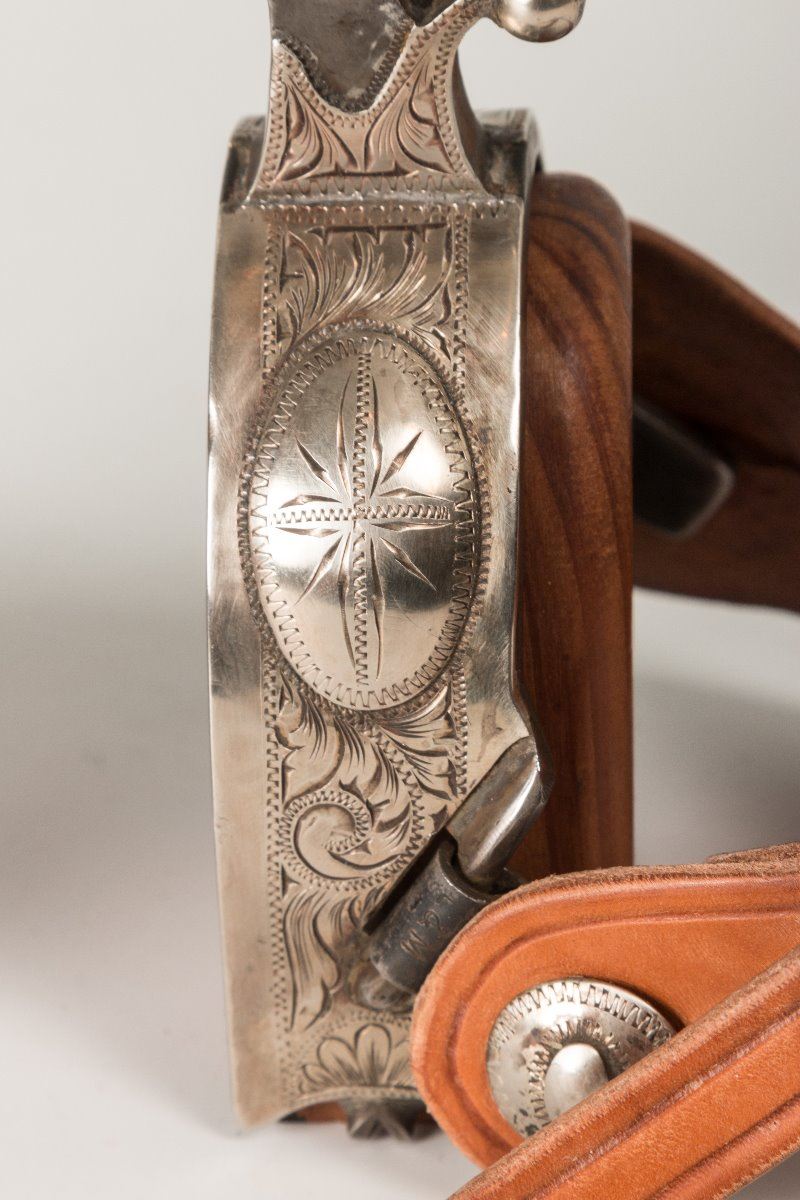 L & M Spurs. 2 ¼", 25 point rowels. Double mounted silver spurs with nicely engraved designs. Handmade and hand-engraved. Contemporary.