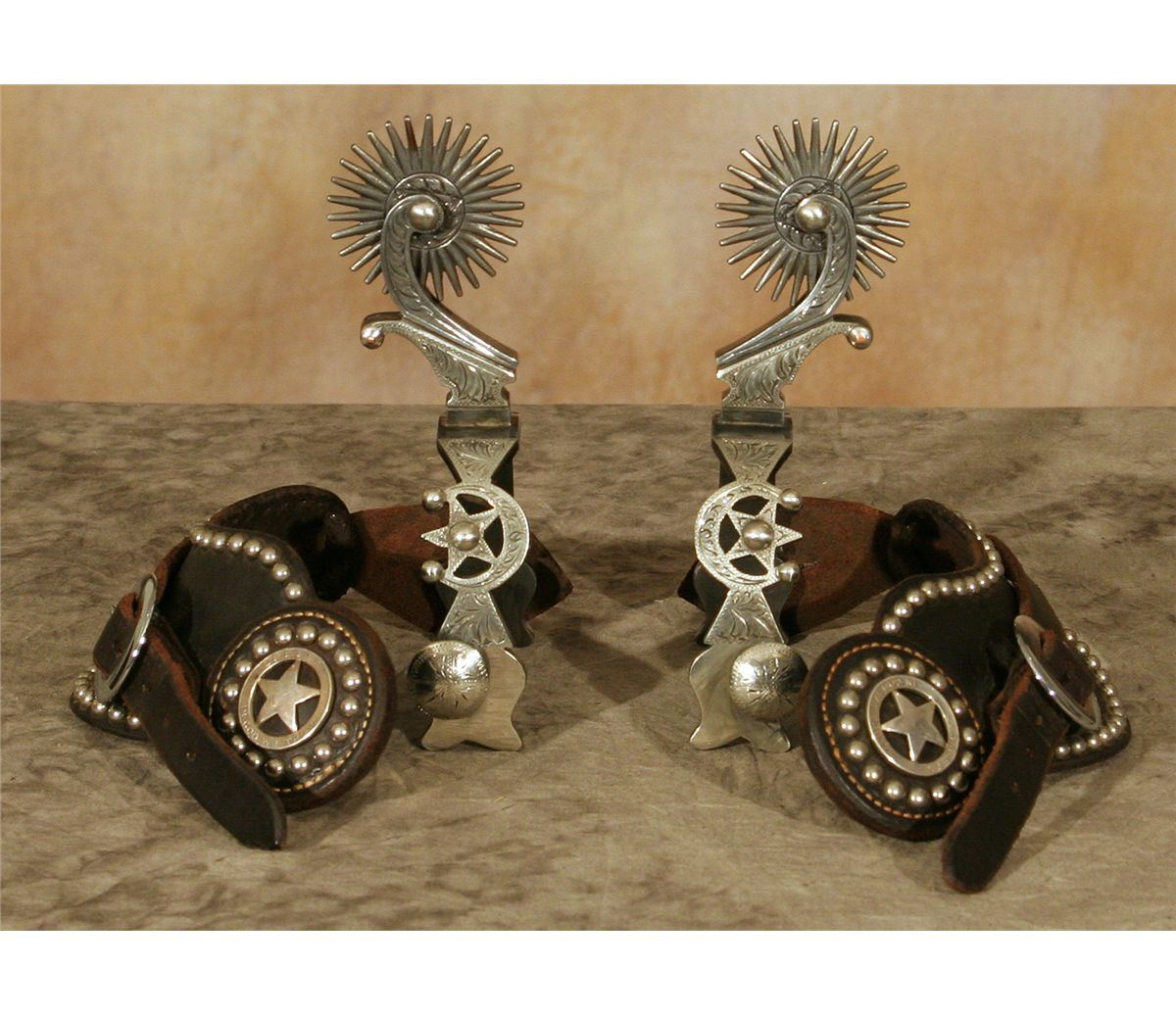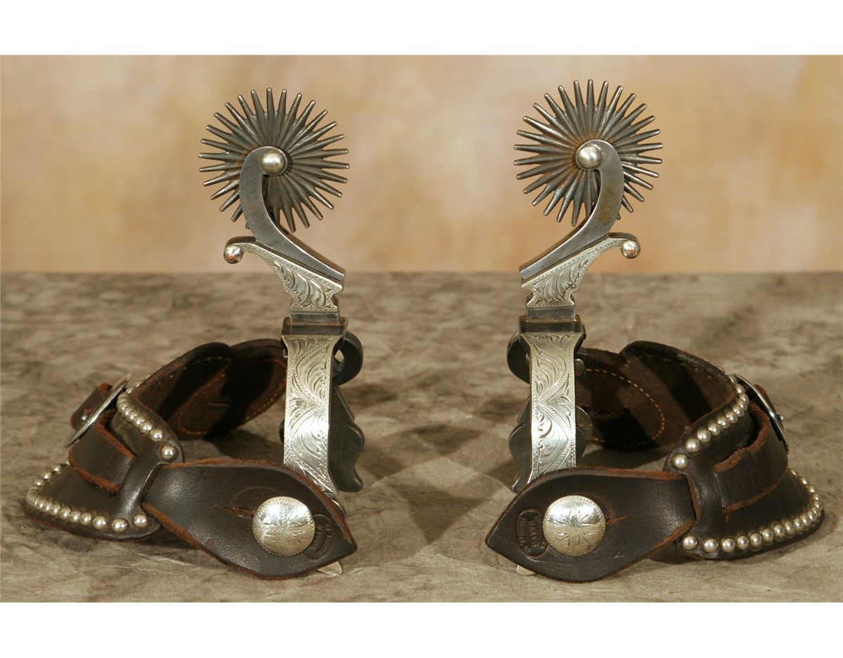L & M Spurs. Denny Lytle and James L. Mower. 3.5" stylized shanks, 30 point rowels. Made for Auction In Santa Fe. With older John Clark straps.