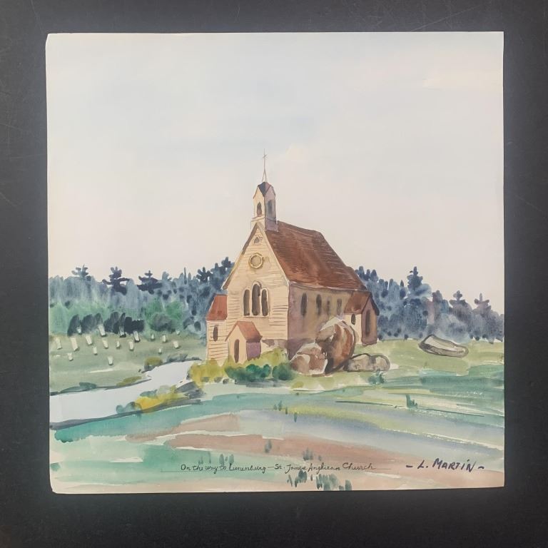 L. Martin's "On the Way to Lunenberg - St. James Anglican Church" original print. This piece is of St. James church, with a forest in the background, done in a watercolour style. This piece is in excellent condition.