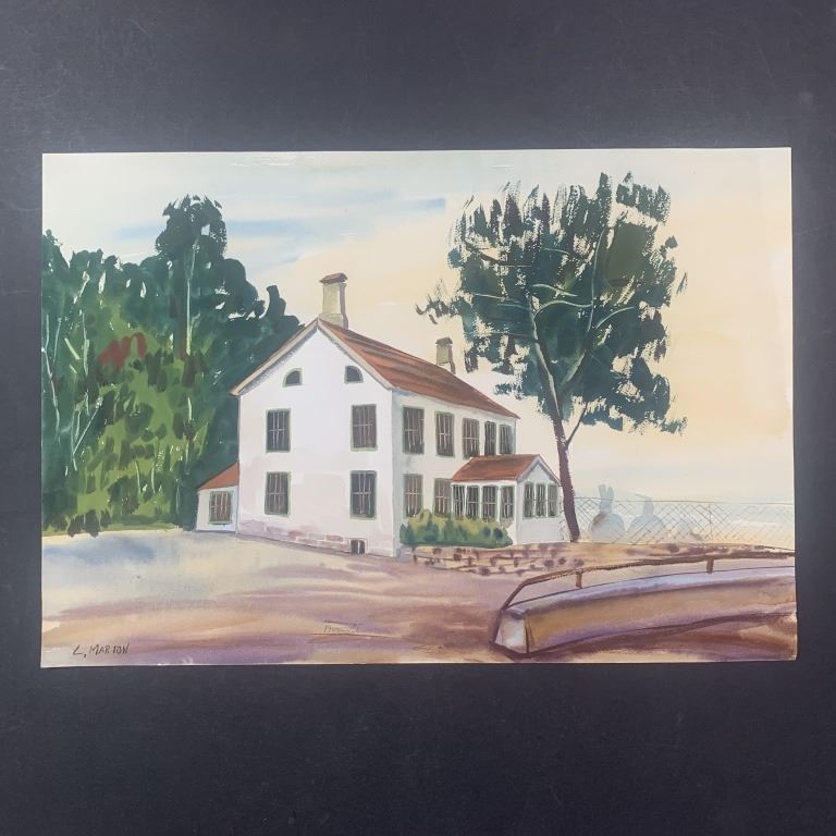 L. Marton original print. This piece is of a home on the beach, with a small scene of the ocean in the background. This piece is in excellent condition.