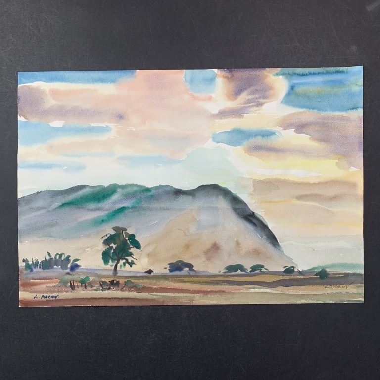 L. Marton' s "After the Storm" original print. This piece is of a mountain range in the background, with a bright colourful sky, done in a watercolour style. This piece is in excellent condition.