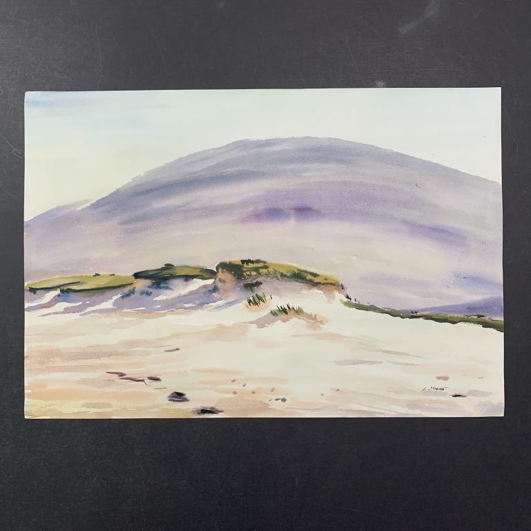 L. Marton's "Dunes" original print. This piece is of dunes in the dessert, with a very large dune in the background, and has been done in a watercolour style. This piece is in excellent condition with a very minor crease lower left corner.
