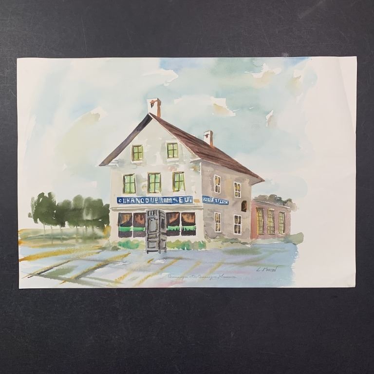 L. Marton's "Ganonoque - The Ganonoque Musuem" original print. This piece is of a white lighthouse, with green trees in the background, and done in a watercolour style. This piece is in very godo to near excellent condition with a crease upper right.