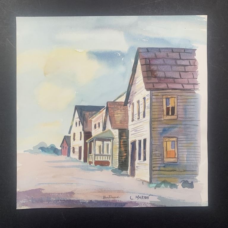 L. Marton's "Hartland" original print. This piece is of a row of homes, in what appears to be winter, done in a watercolour style. This piece is in excellent condition.