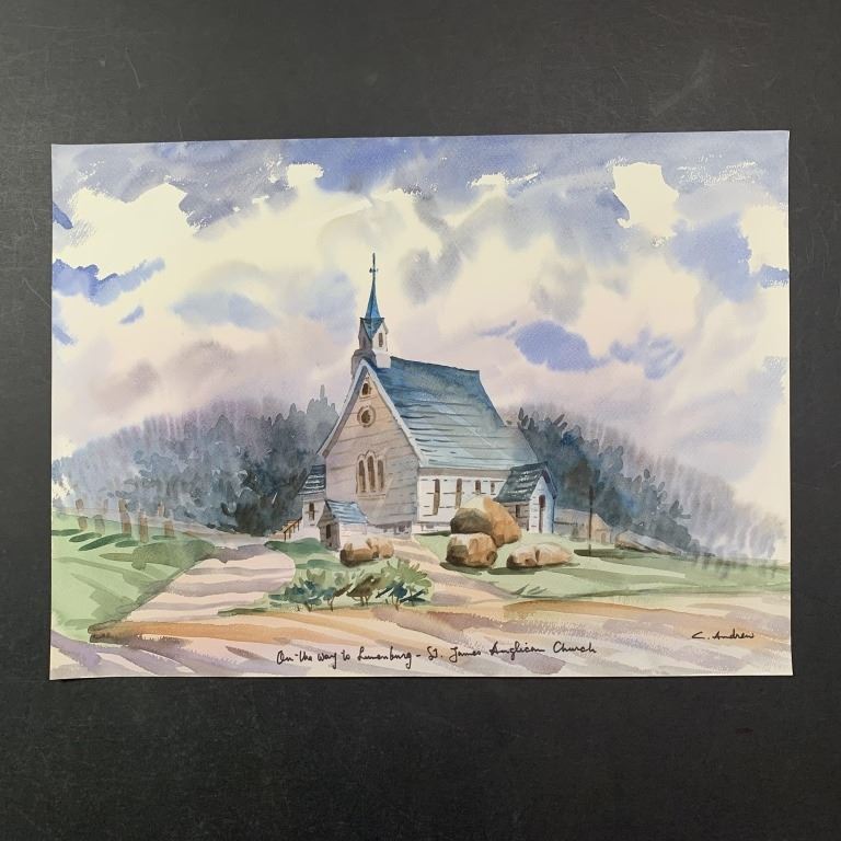 L. Marton's "On the Way to Lunenberg - St. James Anglican Church" original print. This piece is of St. James church, with a forest in the background, done in a watercolour style. This piece is in excellent condition.