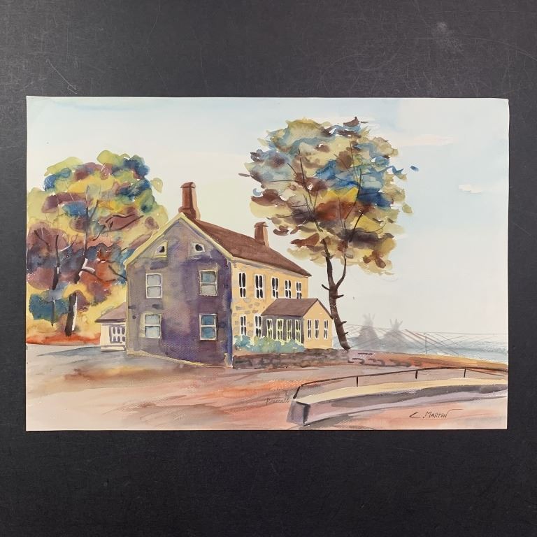L. Marton's "Prescott" original print. This piece is of a home on the edge of the water, with a beautiful waterscene and sky in the background, and done in a watercolour style. This piece is in near excellent condition with a very minor crease upper left corner.