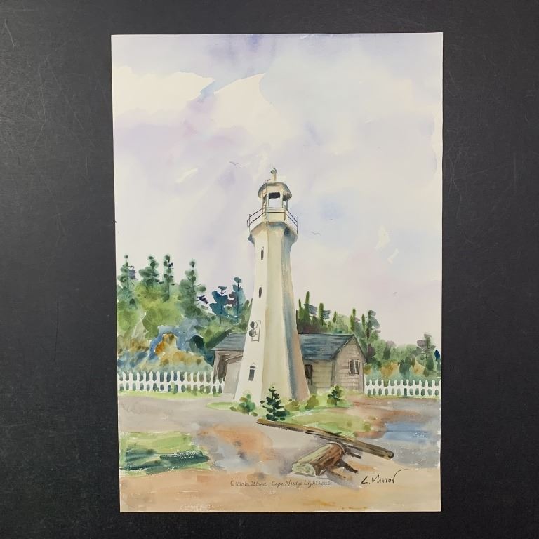 L. Marton's "Quadra Island - Caoe Mudge Lighthouse" original print. This piece is of a white lighthouse, with green trees in the background, and done in a watercolour style. This piece is in excellent condition.