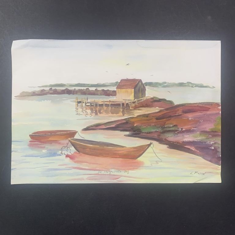 L. Marton's "St. Margarets Bay" original print. This piece is of 2 small row boats in the water, and a small boathouse in the background, done in a watercolour style. This piece is in very good condition with wrinkles upper left corner and lower right corner.