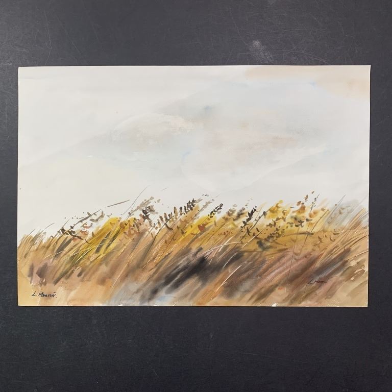 L. Marton's "Wheat Field" original print. This piece is depicts a field of wheat growing, and has been done in a watercolour style. This piece is in good condition with a minor crease (14") from left to upper middle