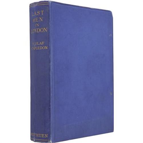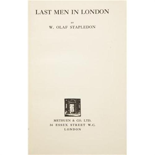 <B>W. Olaf Stapledon. </B></I><B><I>Last Men in London</B></I></B></I><B>.</B></I> London: Methuen & Co. Ltd., [1932]. <BR> <BR>First edition, first impression, second issue. Twelvemo. 312 pages and an eight-page publisher's catalog at end with "932" at bottom of page 8. <BR><BR>Original blue cloth binding with blind ruling on front panel. Gilt lettering on skewed spine. Moderate wear to head and tail of spine, and corner tips. Textblock is lightly age toned and fine. A total of 1,518 copies of Stapledon's elusive second novel were printed, written as a companion to his <I>Last and First Men</B></I> (1930). <I>From the Robert and Diane Yaspan Collection.</B></I><BR><BR><b>Shipping:</b> Books & Catalogs (<a target="_blank" href="http://www.heritageauctions.com/common/shipping.php">view shipping information</a>)
