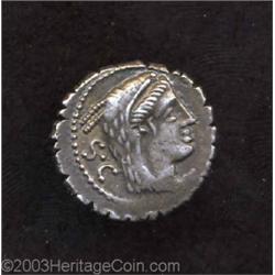 <TABLE cellSpacing=0 cellPadding=0 width="100%" bgColor=#000000 border=0><TBODY> <TR><TD width="100%"><TABLE cellSpacing=1 cellPadding=3 width="100%" border=0><TBODY><TR><TD width="100%" bgColor=#79735c><FONT face=arial color=#ffffff size=3><B>Description</B> </FONT></TD></TR><TR><TD width="100%" bgColor=#ffffff><FONT face=arial size=2><B>L. Procilius.</B></I> 80 B.C. AR denarius (19 mm, 4.06 g). Head of Juno Sospita right; S. C behind / Juno Sospita, holding spear and shield, in biga right; coiled serpent below. Crawford 379/2; Sydenham 772; Procilia 2. Toned, good VF.<BR><I>The types on this coin suggest that the Procilia gens derived from Lanuvium where there existed a large cult of Juno Sospita. It is believed that the moneyer is one and the same as the historian Procilius, and he is also generally identified with the senator who was condemned for misconduct in 56 B.C.</B></I> </FONT></TD></TR></TBODY></TABLE></TD></TR></TBODY></TABLE><BR><A name=PricesRealized></A><TABLE cellSpacing=0 cellPadding=0 width="100%" bgColor=#000000 border=0><TBODY><TR><TD width="100%"><TABLE cellSpacing=1 cellPadding=3 width="100%" border=0><TBODY><TR><TD width="100%" bgColor=#79735c><A name=PR><FONT face=arial color=#ffffff size=3><B>Previous Prices from Heritage Auctions</B> </FONT></A></TD></TR><TR><TD bgColor=#f6f6ed>No Prior Data Recorded </TD></TR><TR><TD bgColor=#ffffff><FONT face=arial size=1 ?>PLEASE NOTE: All prices realized reflect the final hammer price PLUS the buyer's premium in auctions that charge a buyer's premium. Each item has a notation at the top of the listing indicating whether that lot included a buyer's premium. Example: A item that sells with a final hammer price of $100 and a 20% buyer's premium will display with a price realized of $120. All information listed is intended to be as accurate as possible, but errors are possible. Please use this guide carefully and inform us of any inaccuracies. </FONT></TD></TR></TBODY></TABLE></TD></TR></TBODY></TABLE><BR><TABLE cellSpacing=0 cellPadding=0 width="100%" bgColor=#000000 border=0><TBODY><TR><TD width="100%"><TABLE cellSpacing=1 cellPadding=3 width="100%" border=0><TBODY><TR><TD width="100%" bgColor=#79735c colSpan=6><FONT face=arial color=#ffffff size=3><B>Price Guide*</B> </FONT></TD></TR><TR bgColor=#f6f6ed><TD align=middle><B>Grade</B> </TD><TD align=middle><B>Coin World<BR>(Trends)</B> </TD><TD align=middle><B>Numismedia<BR>Retail</B> </TD><TD align=middle><B>Numismedia<BR>Wholesale</B> </TD><TD align=middle><B>Coin<BR>Universe</B> </TD><TD align=middle><B>Heritage<BR>Value Index</B> </TD></TR><TR bgColor=#ffffff><TD colSpan=6><FONT size=1>*All information listed is intended to be as accurate as possible, but errors are possible. No item may be returned or refused based on this information which is provided as a service to our customers. You should contact each pricing source directly to determine the accuracy of this information. </FONT></TD></TR></TBODY></TABLE></TD></TR></TBODY></TABLE><BR><TABLE cellSpacing=0 cellPadding=0 width="100%" bgColor=#000000 border=0><TBODY><TR><TD width="100%"><TABLE cellSpacing=1 cellPadding=3 width="100%" border=0><TBODY><TR><TD width="100%" bgColor=#79735c><FONT face=arial color=#ffffff size=3><B>Population Guide</B> </FONT></TD></TR><TR bgColor=#ffffff> Important notice: Heritage usually auctions material at the rate of 200-250 lots per hour. On some occasions eBay Live bid software or the Internet may not be able to keep up with the pace of the auction. We recommend placing a realistic absentee bid now as insurance to avoid disappointment. Occasionally the auctioneer may eliminate or reject an eBay Live bid, and the auctioneer may also reopen a lot after the close of the eBay live bidding (usually because we missed an audience bid), and may reject your bid even if it shows you as the winning bidder. By bidding via eBay Live, you agree that Heritage may award the lot to another bidder at its sole discretion under the circumstances described above or any other reasonable circumstances. Also please note that all Heritage lots purchased through eBay Live carry a 20% Buyer's Premium. Please make sure you read the Terms and Conditions before you bid.</TD></TR></TBODY></TABLE></TD></TR></TBODY></TABLE>