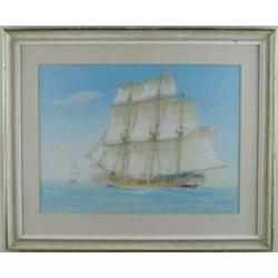 Lot # 803 L. R. ARMSTRONG (20th Century) THE “RATTLESNAKE” IN BATTLE. Pastel scene shows the British ship “Rattlesnake” firing upon a fleeing ship. The ship is sailing right to left flying British flag. Titled bottom right in pencil and signed bottom left. Housed in a white painted wood frame with white matte. SIGHT SIZE: 17-3/4” x 23-1/2”. CONDITION: Good. 9-99547 (300-500)