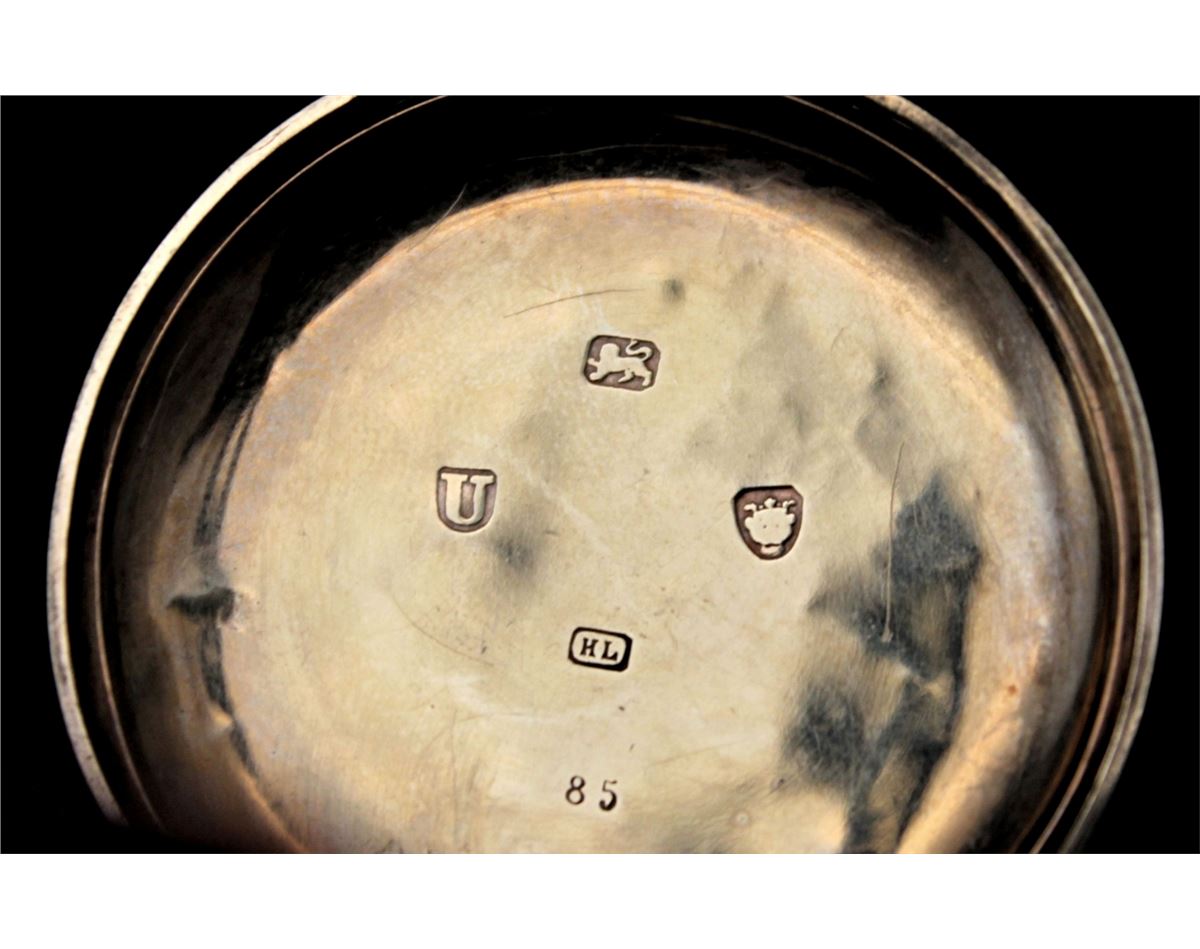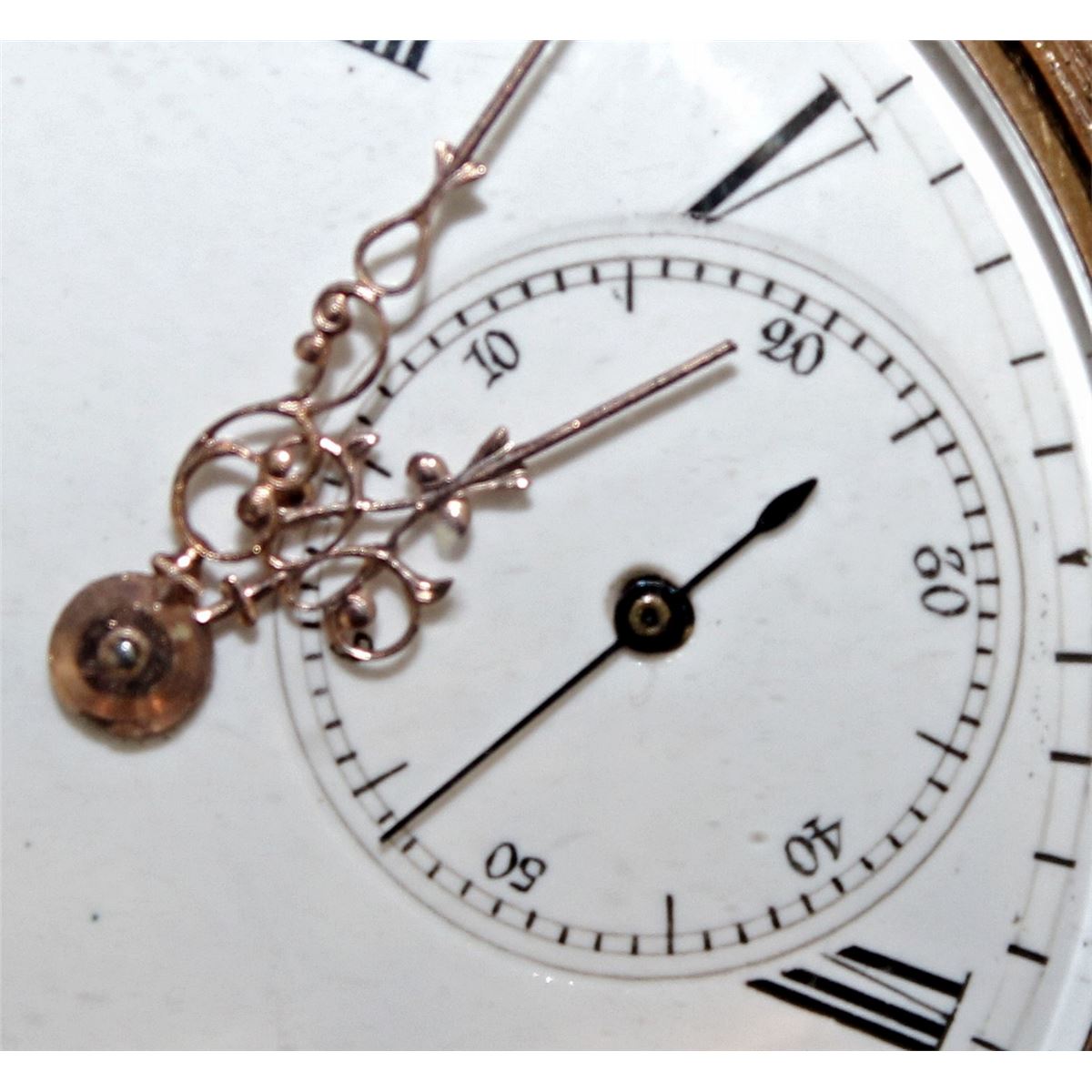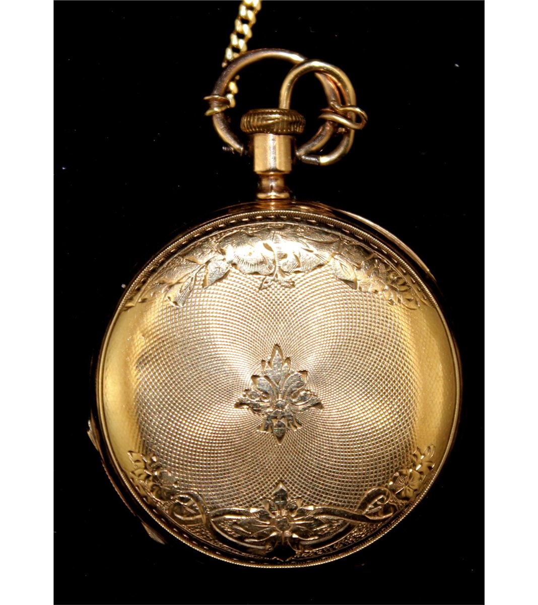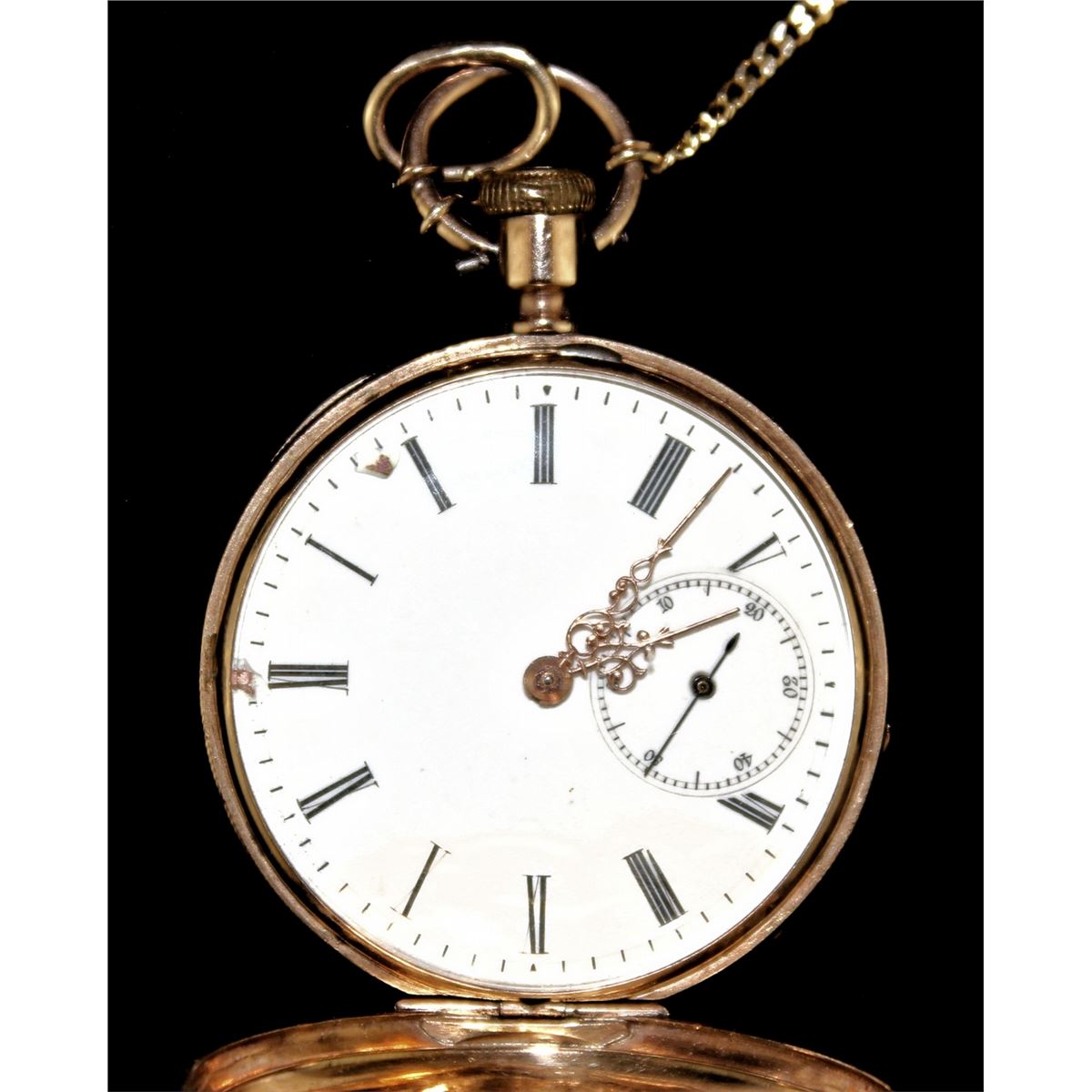 Swiss,. Patent strait line lever, jeweled in 23 actions, No. 83985, the case with two English yellow gold hinged covers. The circular dial with Roman numerals and inset seconds subdial. Diameter of case, 1.5 inches