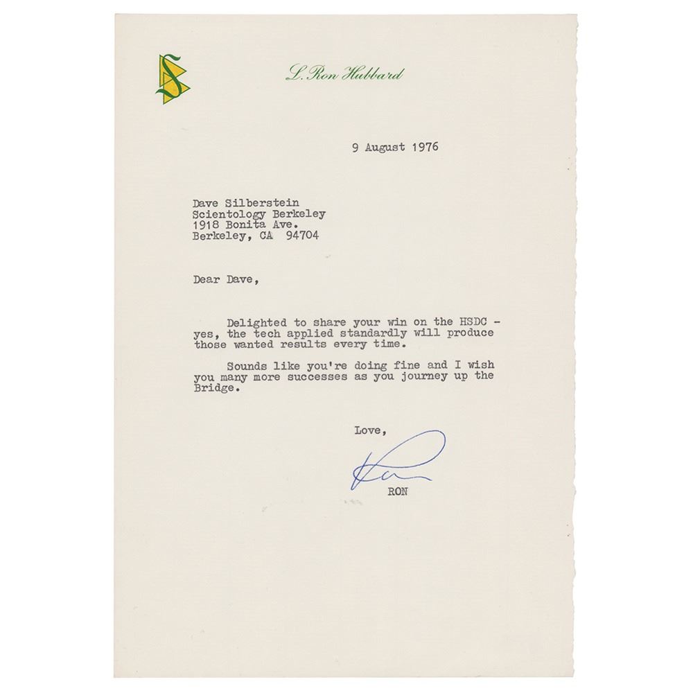 TLS signed “Ron,†one page, 7 x 10, personal letterhead, August 9, 1976. Letter to Dave Silberstein of Scientology Berkeley, making reference to the Hubbard Standard Dianetics Course. In full: "Delighted to share your win on the HSDC—yes, the tech applied standardly will produce those wanted results every time. Sounds like you're doing fine and I wish you many more successes as you journey up the Bridge." In fine condition, with a Beckett label affixed to the reverse. Accompanied by a certificate of authenticity from Beckett Authentication Services.