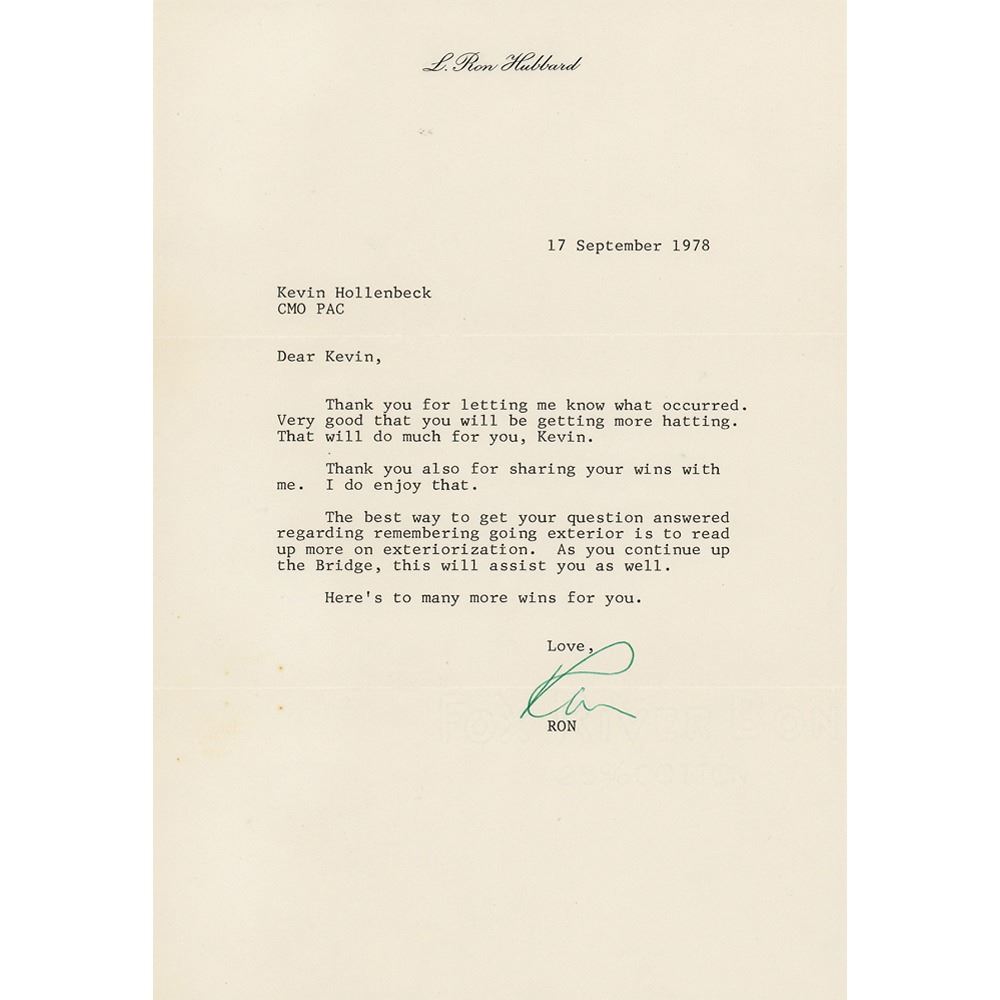 TLS signed “Ron,” one page, 7.25 x 10.5, personal letterhead, September 17, 1978. Letter to Kevin Hollenbeck, in full: "Thank you for letting me know what occurred. Very good that you will be getting more hatting. That will do much for you, Kevin. Thank you also for sharing your wins with me. I do enjoy that. The best way to get your question answered regarding remembering going exterior is to read up more on exteriorization. As you continue up the Bridge, this will assist you as well. Here's to many more wins for you." In fine condition.