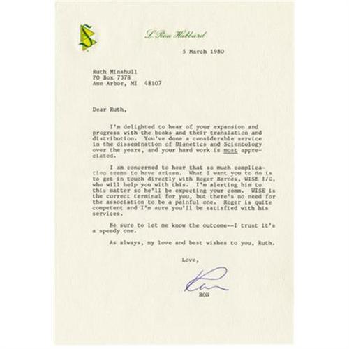 <B>L. Ron Hubbard Typed Letter Signed,</B></I> “<I>Ron</B></I>”, one page on personal letterhead, 7” x 10”, n.p., March 5, 1980, to Ruth Minshull, Ann Arbor, Michigan. The letter reads in part, “<I>…You've done a considerable service in the dissemination of Dianetics and Scientology over the years, and your hard work is most appreciated. I am concerned to hear that so much complication seems to have arisen…get in touch directly with Roger Barnes…Roger is quite competent and I'm sure you'll be satisfied with his services.</B></I>” Lafayette Ronald Hubbard (1911-1986), a prolific author of pulp fiction, is best remembered as the controversial founder of the Church of Scientology. Excellent condition.<BR><BR><b>Shipping:</b> Framed - without Glass, Medium (<a target="_blank" href="http://www.heritageauctions.com/common/shipping.php">view shipping information</a>)