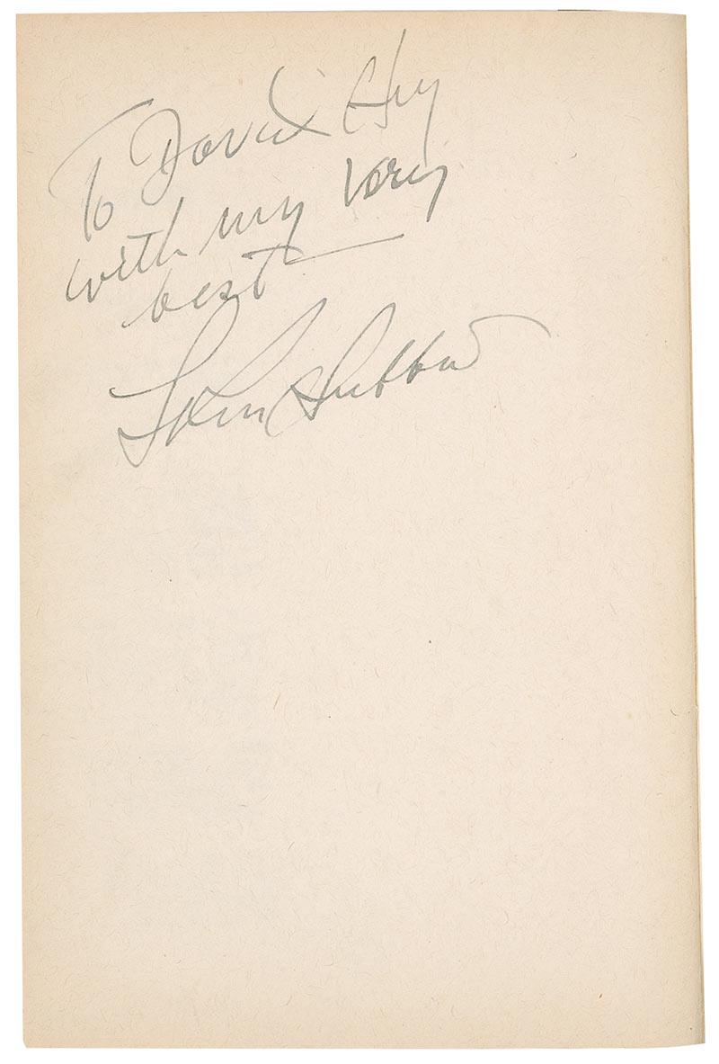 Pulp and science-fiction author (1911–1986) who became a lightning rod for controversy as the founder of the Church of Scientology. Signed book: Final Blackout. First edition. Providence, Rhode Island: Hadley Publishing, 1948. Hardcover with dustjacket, 5.5 x 7.75. Signed and inscribed in fountain pen opposite the half-title page, “To David Hey with my very best—L. Ron Hubbard.” Some mild edge toning to the pages and corner dings to the boards, otherwise fine condition. The dustjacket rates very good with a clipped corner, heaving toning and soiling, creasing, paper loss at the head and tail of the spine, and partial separation of the front cover along the spine.