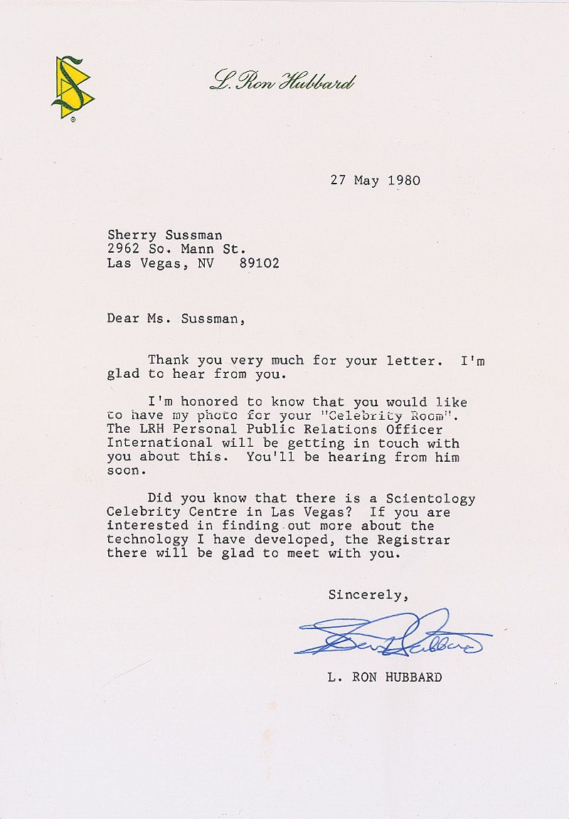 Pulp and science-fiction author (1911–1986) who became a lightning rod for controversy as the founder of the Church of Scientology. TLS, one page, 7 x 10, personal letterhead, May 27, 1980. Letter to an autograph collector. In part: “I’m honored to know that you would like to have my photo for your ‘Celebrity Room.’ The LRH Personal Public Relations Officer International will be getting in touch with you about this. You’ll be hearing from him soon. Did you know that there is a Scientology Celebrity Centre in Las Vegas? If you are interested in finding out more about the technology I have developed, the Registrar there will be glad to meet with you.” In fine condition, with a spot of soiling to the bottom.