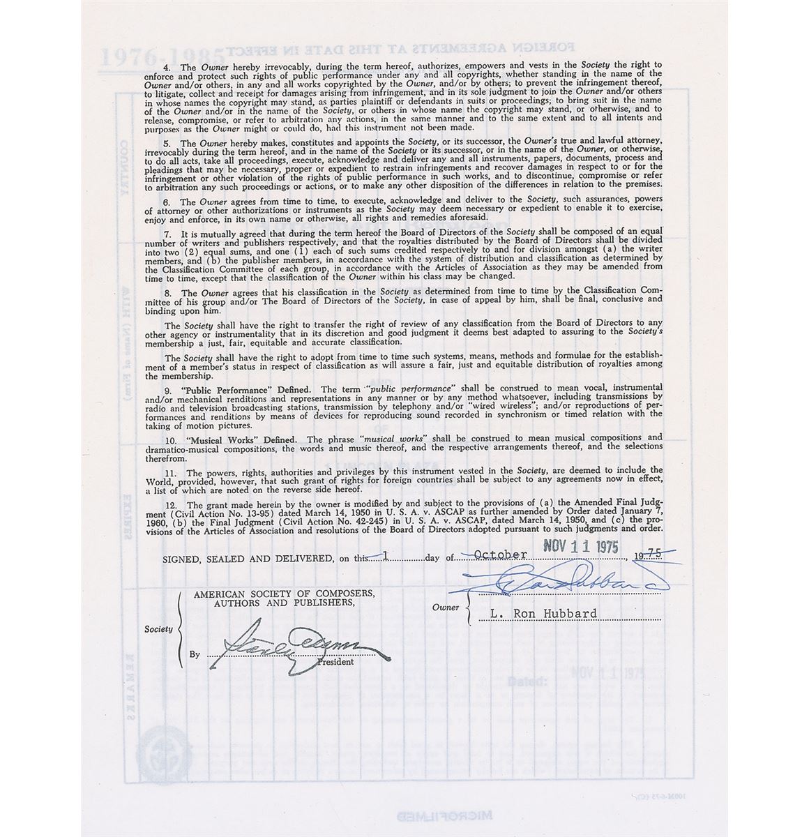 Pulp and science-fiction author (1911–1986) who became a lightning rod for controversy as the founder of the Church of Scientology. DS, four pages both sides, 8.5 x 11, November 11, 1975. Standard agreement between Hubbard and ASCAP concerning membership in the performing rights organization. In fine condition. A particularly intriguing document given Scientology’s close association with the entertainment industry.