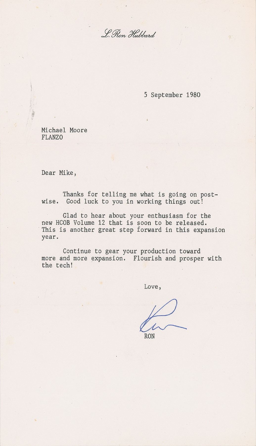Pulp and science-fiction author (1911-1986) who became a lightning rod for controversy as the founder of the Church of Scientology. TLS signed “Ron,” one page, 7.25 x 10.5, personal letterhead, September 5, 1980. Letter to Michael Moore, in full: "Thanks for telling me what is going on post-wise. Good luck to you in working things out! Glad to hear about your enthusiasm for the new HCOB Volume 12 that is soon to be released. This is another great step forward in this expansion year. Continue to gear your production toward more and more expansion. Flourish and prosper with the tech!" In fine condition. Hubbard Communications Office Bulletins (HCOB) were technical bulletins of dianetics and scientology that were published between 1950 and 1984.