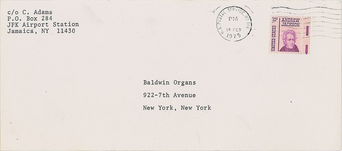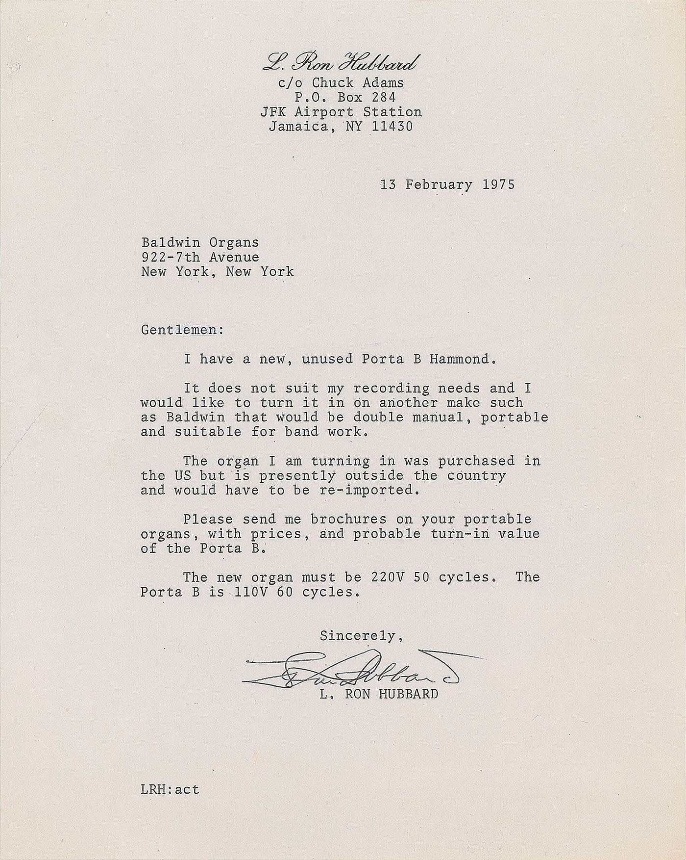 Pulp and science-fiction author (1911–1986) who became a lightning rod for controversy as the founder of the Church of Scientology. TLS, one page, 8 x 10, personal letterhead, February 13, 1975. Letter to Baldwin Organs in New York, in part: "I have a new, unused Porta B. Hammond. It does not suit my recording needs and I would like to turn it in on another make such as Baldwin that would be double manual, portable and suitable for band work. The organ I am turning in was purchased in the US but is presently outside the country and would have to be re-imported. Please send me brochures on your portable organs, with prices, and probable turn-in value of the Porta B." In fine condition, with staple holes to the upper left. Accompanied by the original mailing envelope.