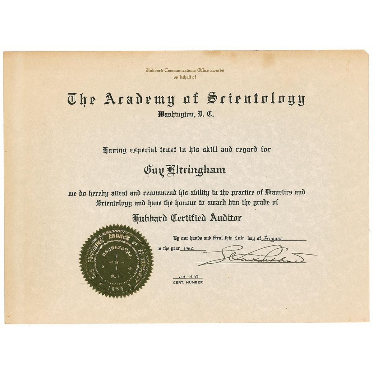 Unusual partly-printed DS, one page, 12 x 9, August 2, 1962. Hubbard awards Guy Eltringham the grade of Hubbard Certified Auditor, signed at the conclusion in black ink by Hubbard. A few light creases, and mild toning along top edge, otherwise fine condition. The gold foil seal is crisp and intact. The first such Hubbard document we’ve seen.
