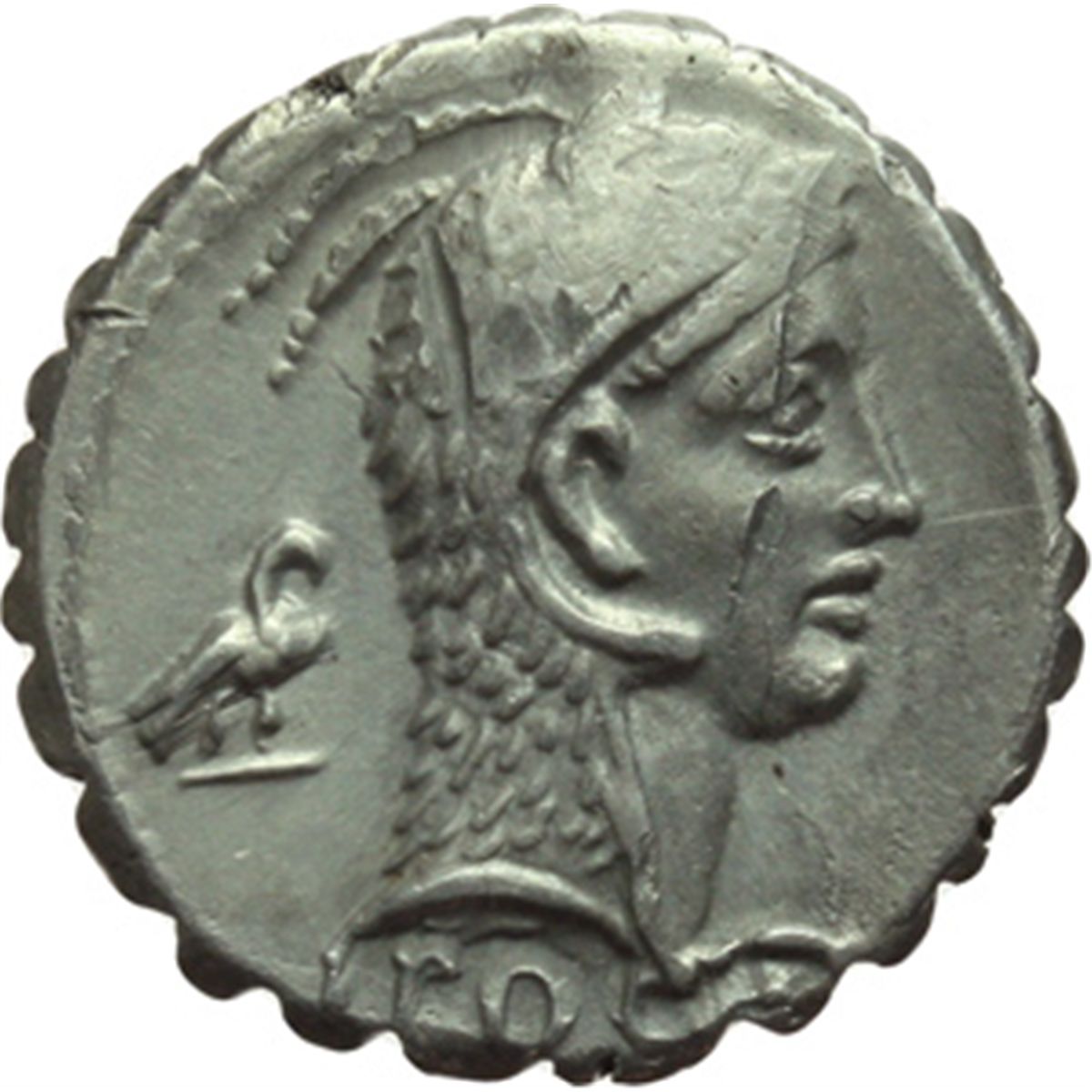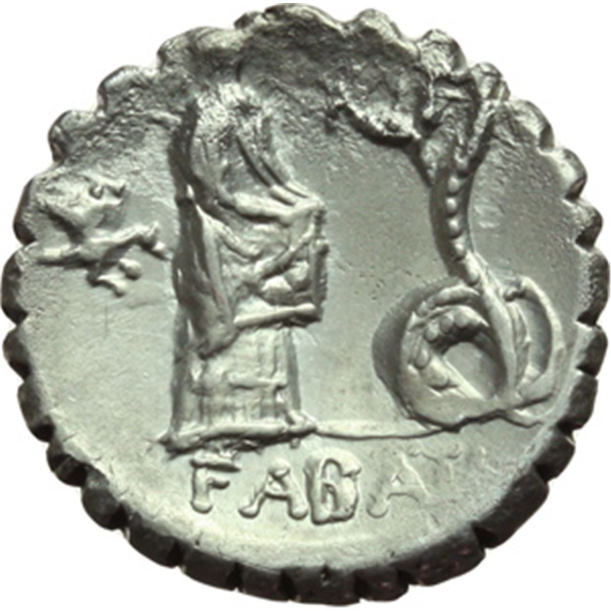 Repubblica Romana. L. Roscius Fabatus. Denario, 64 a.C. D/ Testa di Iuno Sospita a destra. Sotto, L. ROSCI. Dietro, aquila stante a destra. R/ Fanciulla stante a destra offre cibo a serpente mostruoso eretto di fronte a lei. Dietro, anatra vola a destra. In esergo: FABATI. Cr.412/1. B.3. AG. g. 3.85 mm. 17.50 R. Variante rara, assente in Banti. BB.