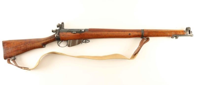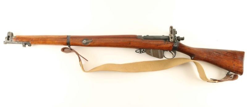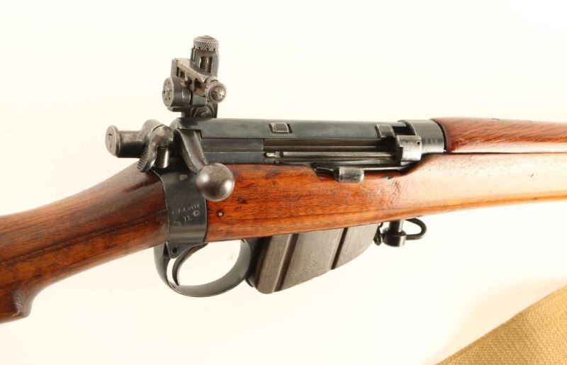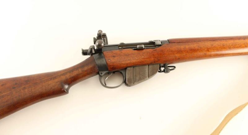 English made magazine-fed bolt action sporting rifle chambered in .303 British. Retailer marked by Westley Richards & Co. of London. Features a blued finish, 25.2" SMLE barrel, ramped patridge front sight, front volley sight, adjustable rear sight with Parker variable aperture diopter installed in place of the rear volley sight, metal nose cap with bayonet lug & 'rabbit ear' front sight shrouds, serrated trigger, engraved 10 round magazine with attached link, magazine cut-off on the right side of the receiver, dust cover & manual safety on the bolt, tan canvas sling and three-piece smooth wood SMLE furniture. The right side of the butt socket is marked "L.S.A. Co Ld/II.*,"the receiver ring is stamped "LEE-SPEED/PATENTS/222" and the dust cover is inscribed "WESTLEY RICHARDS &Co LONDON." The magazine displays a mottled aged brown patina while the balance of the rifle displays approximately 70% of it's blued finish with heavy wear on the nose cap. Action is smooth, the bore is pristine and the wood stocks are very good. Condition is NRA Very Good. ***C&R Firearm*** From The John F Sukey Collection